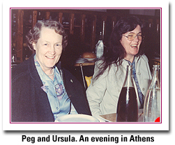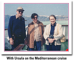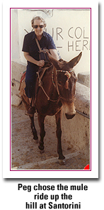 My Peg and I have had a very full life together. We certainly have done a great deal of traveling around. There were the European trips described above, with camping trips to various European countries whenever possible. Peg and I went on three cruises. The first was to Greece and various Greek islands. A few years later in 1983, we met Ursula in Munich and the three of us flew to Athens and went off on another Mediterranean cruise. A memorable part of it involved two weeks on the mainland in Athens and a trip across the Peloponnesian Peninsula with Ursula driving our rented Volkswagen. There, by prearrangement, we stayed with Peter Stathanopolous, a former Greek Ph.D. student of mine at Brandeis, now a full professor, and the next day he accompanied us back to Athens, where he teaches, by way of Corinth, as I recall, and Delphi for a "consultation" with the oracle. Much later, Peg and I took a fine cruise to the southern Caribbean.
