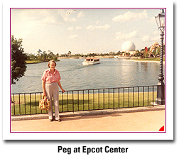At some point, Peg and I made a motor trip to Florida, staying in motels. We went to Busch Gardens, the Epcot Center, and some other facilities I can't recall now. The trip was pleasant and uneventful except that on the way down through the Carolinas we encountered a late spring ice storm which made tree limbs fall and iced up the road dangerously. We got through all right..