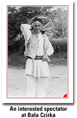 guide. As the local people began to assemble around us, he determined that there was no campground at all there, but that we could simply camp overnight on a small green meadow in the middle of the village. At first, the men of the village came out to see us and our strange vehicle and our camping pup tents as we set them up. They formed a circle, and at the head of the circle stood three men - the mayor, the school teacher, and the Orthodox priest. Soon, as we worked away readying the tents and preparing our evening meal, the men gave way to the village women, who replaced them on the circle. The villagers were curious and bold, but friendly. It was quite an experience for us in this isolated corner of the world.